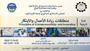دورة تدريبية عن منطلقات ريادة الاعمال والابتكار ينظمها اتحاد الصناعات العراقي بالتعاون مع المجلس الاستشاري الصناعي في الجامعة الثلاثاء – الخميس 22-24 / 7 / 2025 الساعة 09:00 – 12:00 ظهرا القاعة المركزية – اتحاد الصناعات العراقي في بغداد – …