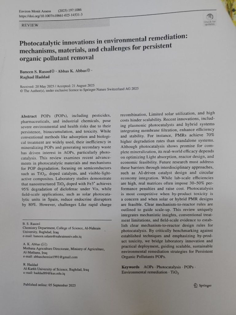 نشرت التدريسية في جامعة الكرخ للعلوم م.م رغد علي عبد الرسول بحثاً علمياً ضمن فريق بحثي ضم جامعة الكرخ للعلوم وجامعة النهرين ووزارة الزراعة في مجلة عالمية رصينة لدار النشر Spring Nature ذات معامل تأثير 3.2 والمصنفة ضمن الربع الثاني Q2 من مستوعبات سكوباس وكلاريفيت