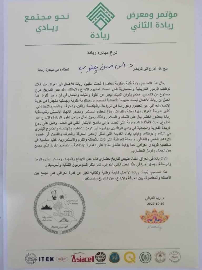 تدريسية في جامعة الكرخ للعلوم تُكرَّم بدرع ريادة للتميز والإبداع في مؤتمر ومعرض ريادة الثاني