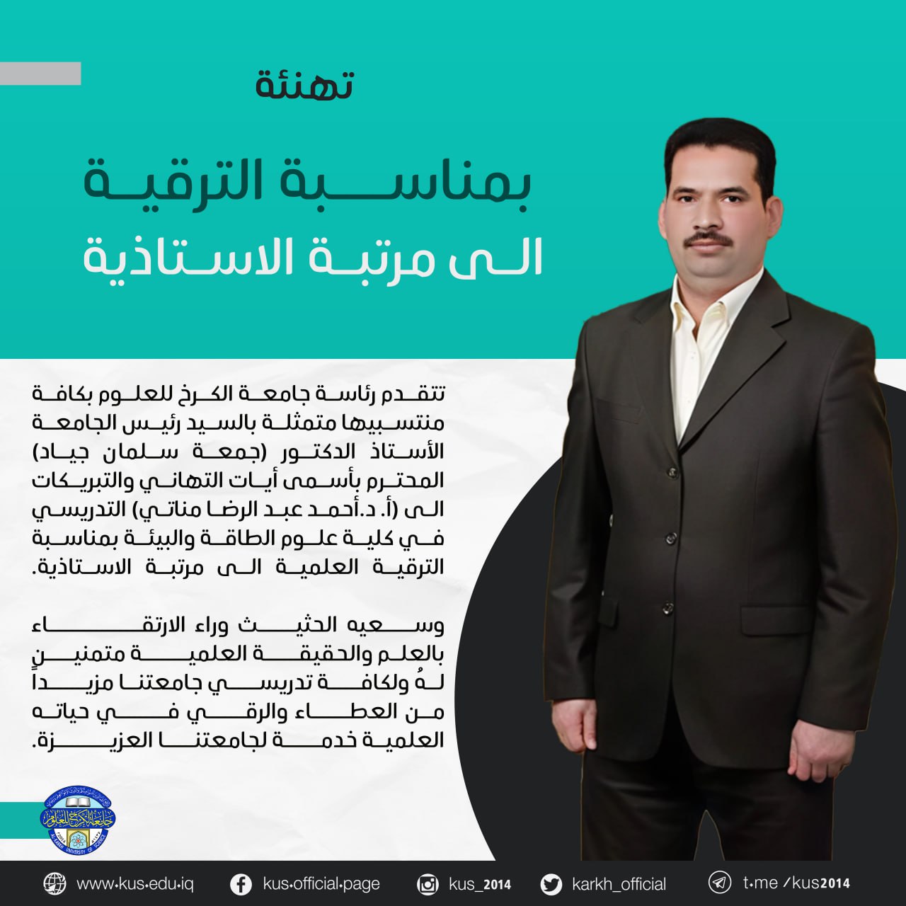 تتقدم رئاسة جامعة الكرخ للعلوم بكافة منتسبيها متمثلة بالسيد رئيس الجامعة الأستاذ الدكتور( جمعة سلمان جياد) المحترم بأسمى أيات التهانــي والتبريكات الــــــــى (أ. د احمد عبد الرضا مناتي) التدريسي في كلية علوم الطاقة والبيئة بمناسبة الترقيــــة العلمية الى مرتبة الاستاذية.