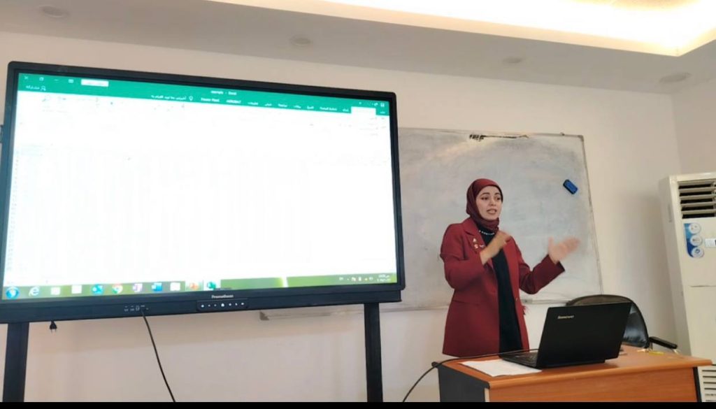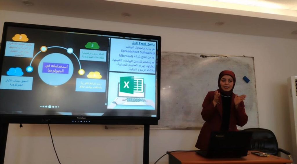 وقدّمت الدورة التدريسية في كلية التحسس النائي والجيوفيزياء بالجامعة (م. مروة حاتم خضير) ، حيث تناولت محاور متعددة أبرزها: كيفية إدخال البيانات الجيولوجية وتحليلها إحصائياً، إنشاء الرسوم البيانية التوضيحية، واستخدام المعادلات والنماذج الحسابية في تطبيقات تخص علوم الأرض.