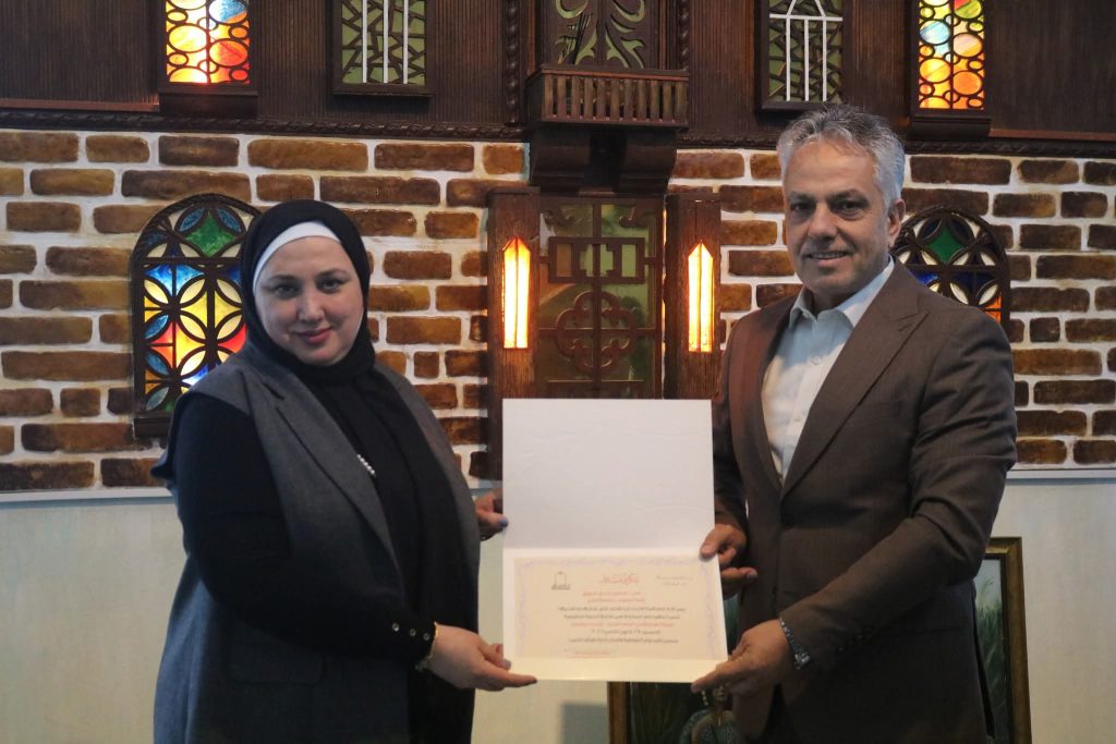 وفي ختام الفعالية، تم تقديم شهادة تقديرية للأستاذة الدكتورة ندى فاروق، تثميناً لجهودها ودورها الفاعل في تنمية القدرات النسائية ودعم مسيرة المرأة في ميادين العمل المختلفة.