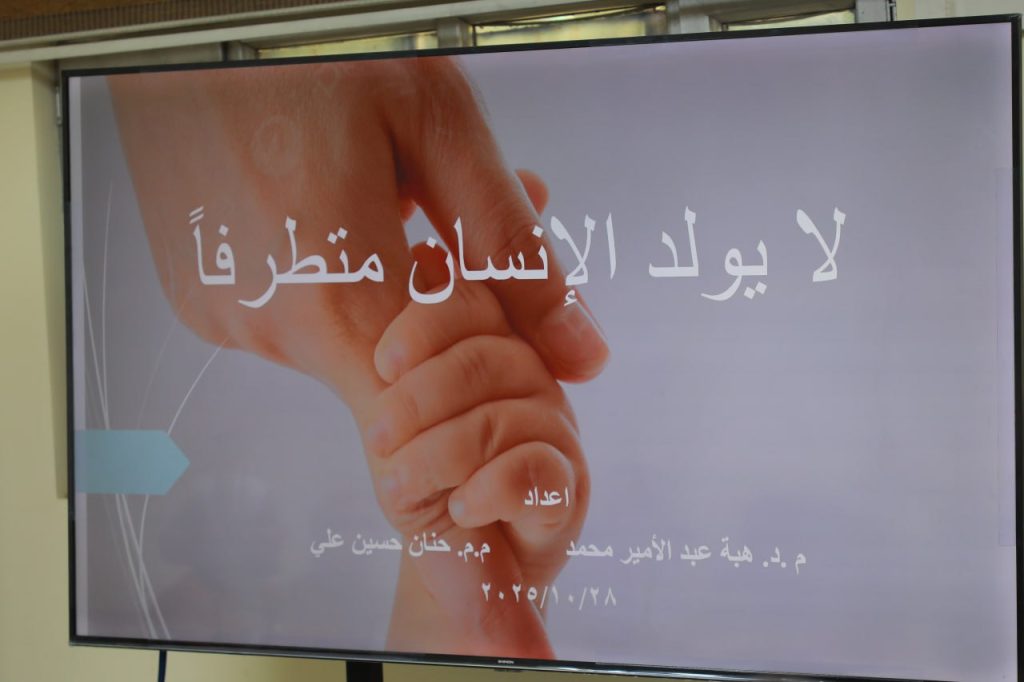 قدمت الورشة التدريسيتان م.د. هبة عبد الأمير محمد و م.م. حنان حسين ، وتناولت محاورها أهمية تعزيز الوعي الفكري والسلوكي بخطورة التطرف وأثره على الفرد والمجتمع، إلى جانب ترسيخ قيم التسامح والاعتدال والحوار كمدخل أساسي للوقاية من انتشار الفكر المتطرف وسبل معالجته.