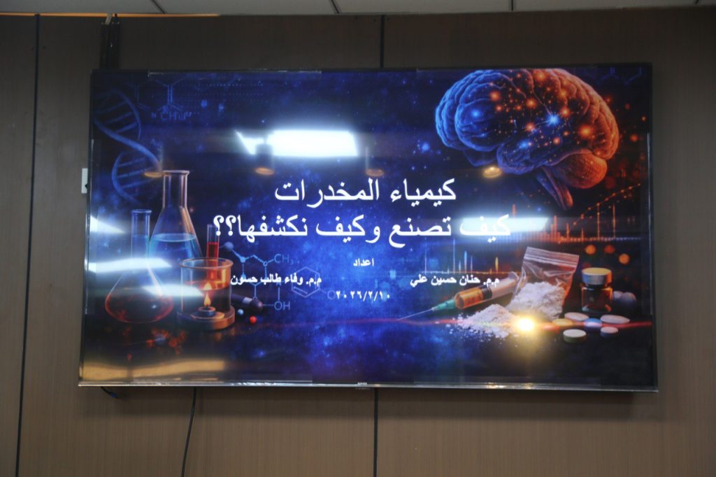وتناولت الورشة، التي قدمتها كل من م.م حنان حسين علي وم.م وفاء طالب حسون، شرحاً مبسطاً للأسس الكيميائية للمواد المخدرة، وآلية تأثيرها في الجهاز العصبي، إضافة إلى استعراض أهم التقنيات الحديثة المستخدمة في الكشف عنها، مثل التحاليل المختبرية والأجهزة المتخصصة في الفحص الكيميائي.