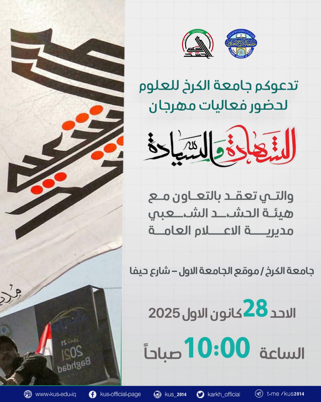 تدعوكم جامعة الكرخ للعلوم لحضور فعاليات مهرجان “الشهادة والسيادة” والذي يعقد بالتعاون مع هيـ.ـئـ.ة الحـ.ـشـ.د الشـ.عـ..بي /مديرية الاعلام العامة الموقع : قاعة شهداء العراق – موقع الجامعة الاول في شارع حيفا التاريخ : الاحد 28 كانون الاول 2025 الساعة : …