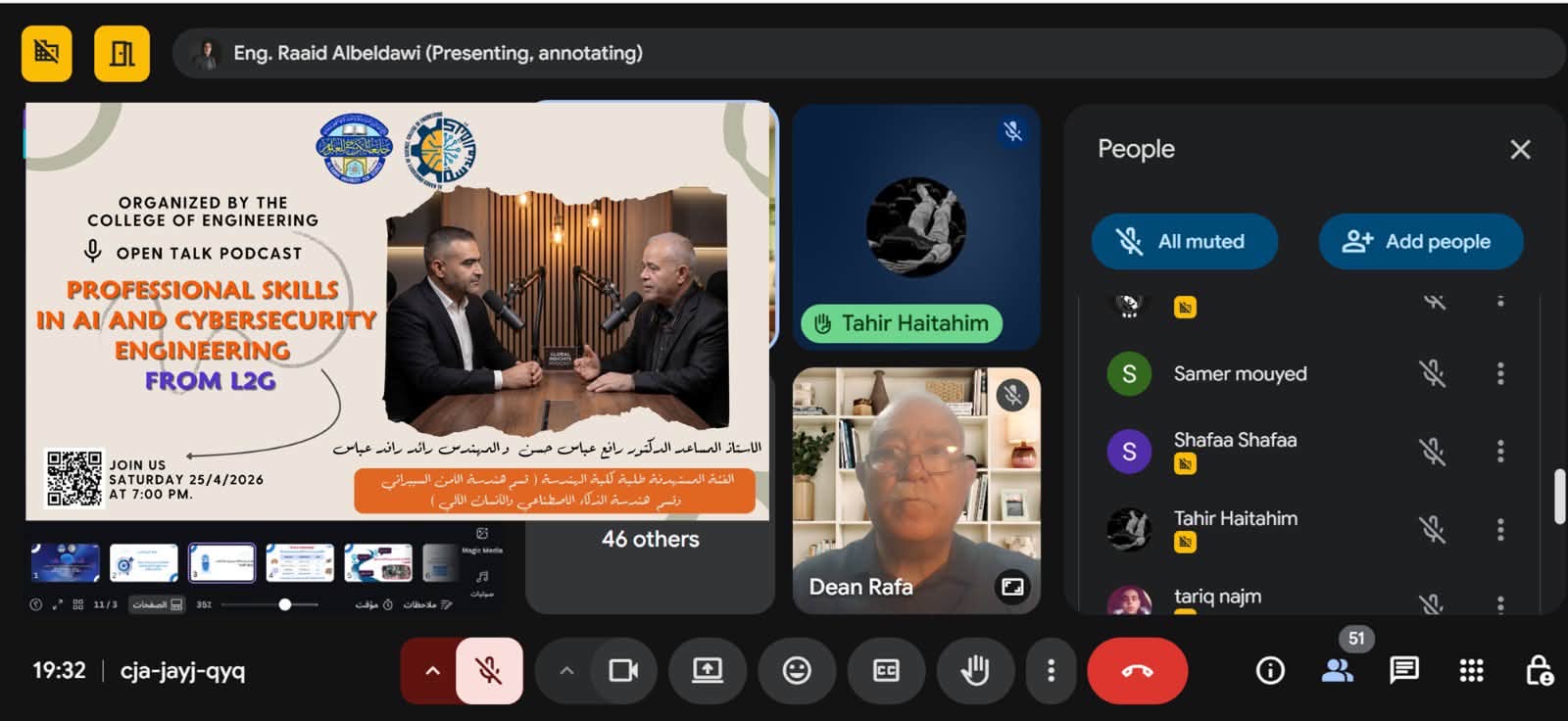 نظمت عمادة كلية الهندسة مساء يوم السبت الموافق 25 نيسان 2026 أول تجربة بودكاست لطلبة أقسام هندسة الذكاء الاصطناعي وهندسة الأمن السيبراني حول أهم المهارات المطلوبة لطلبة الاختصاصات أعلاه والتي تؤهلهم للولوج إلى سوق العمل بعد تخرجهم.