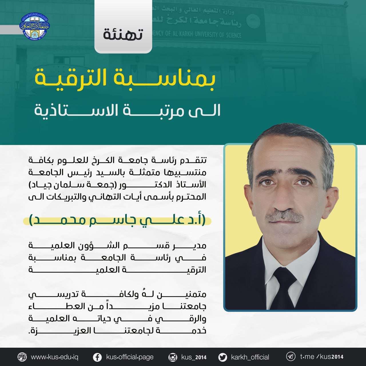 On behalf of all its staff, the Presidency of Al-Karkh University of Science, represented by the esteemed University President, Prof. Dr. Jumaa Salman Jiyad, extends its warmest congratulations and best wishes to Prof. Dr. Ali Jasim Mohammed, Director of the Scientific Affairs Department at the University Presidency, on the occasion of his academic promotion to the rank of Professor.