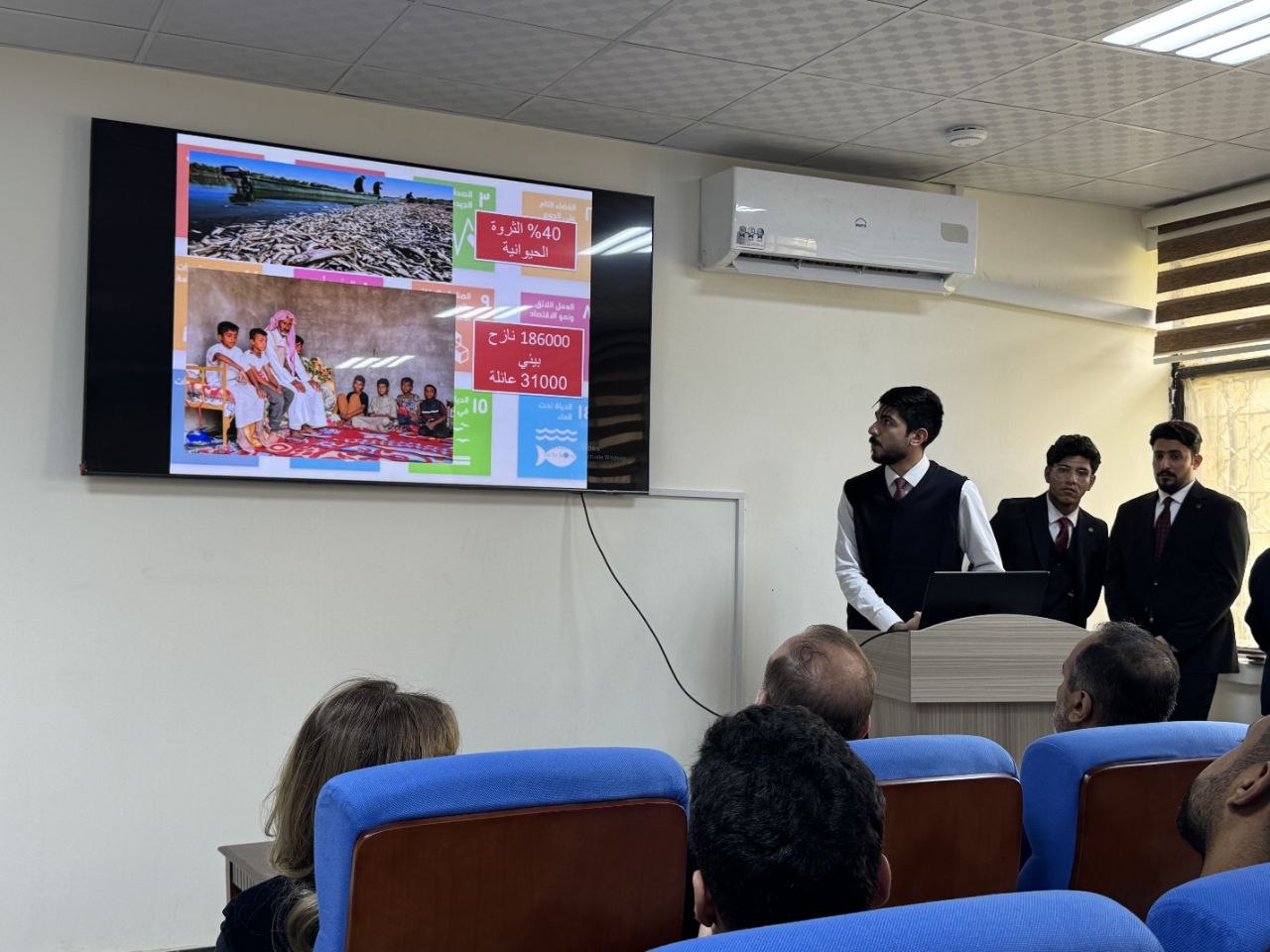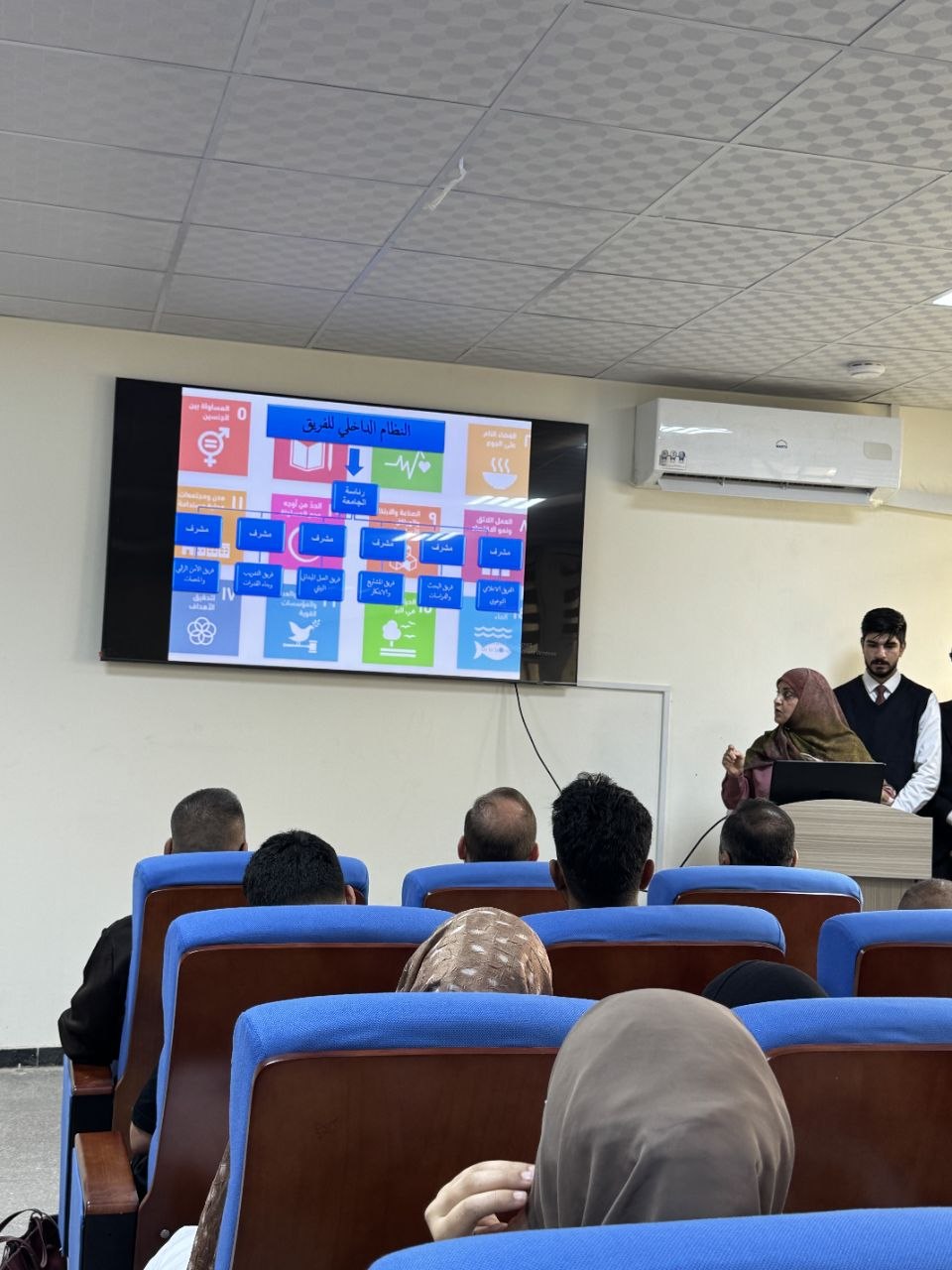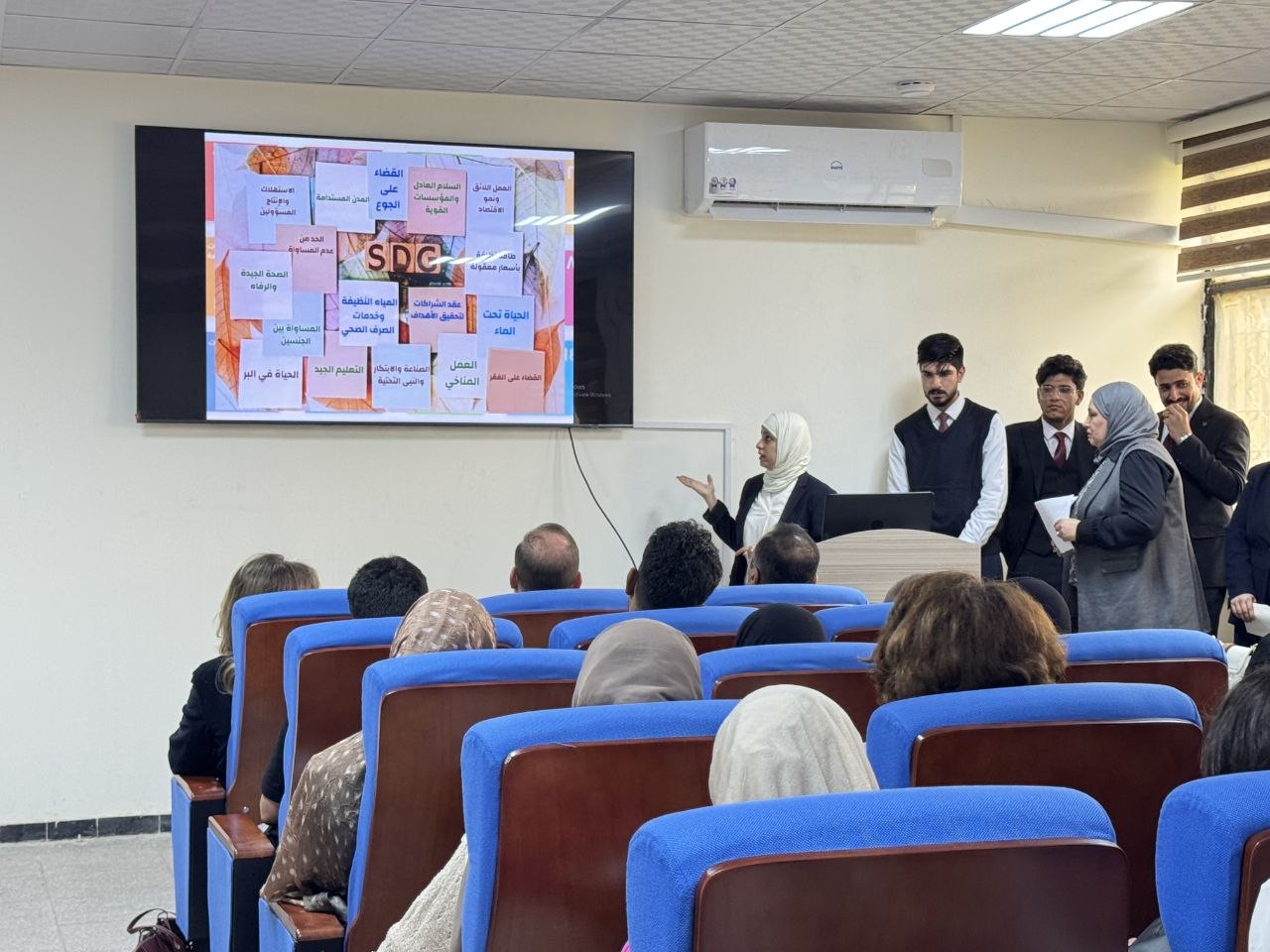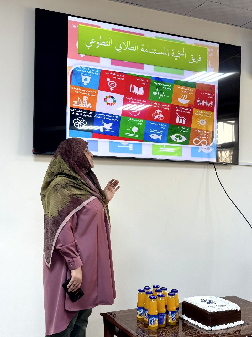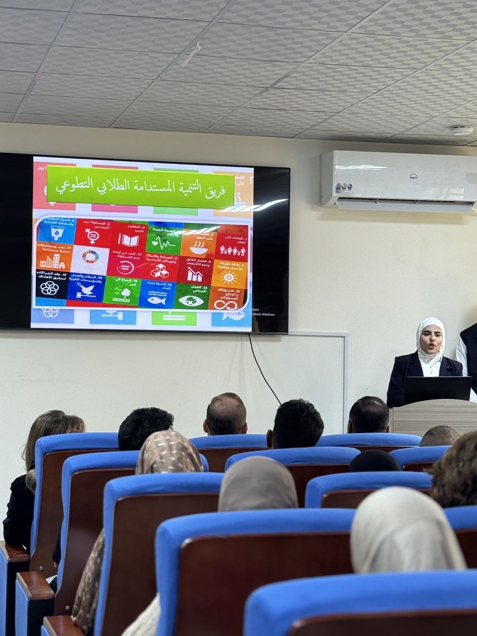 وتضمن الملتقى مشاركة فاعلة من أعضاء الفريق من الطلبة، حيث قدموا عرضاً موجزاً تناول مبررات اعتماد أهداف التنمية المستدامة السبعة عشر، وأهمية دور الفرق التطوعية في الإسهام بتحقيق هذه الأهداف على أرض الواقع.