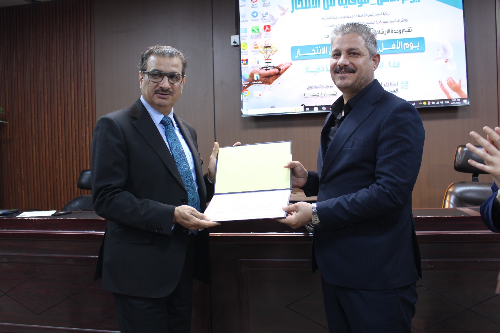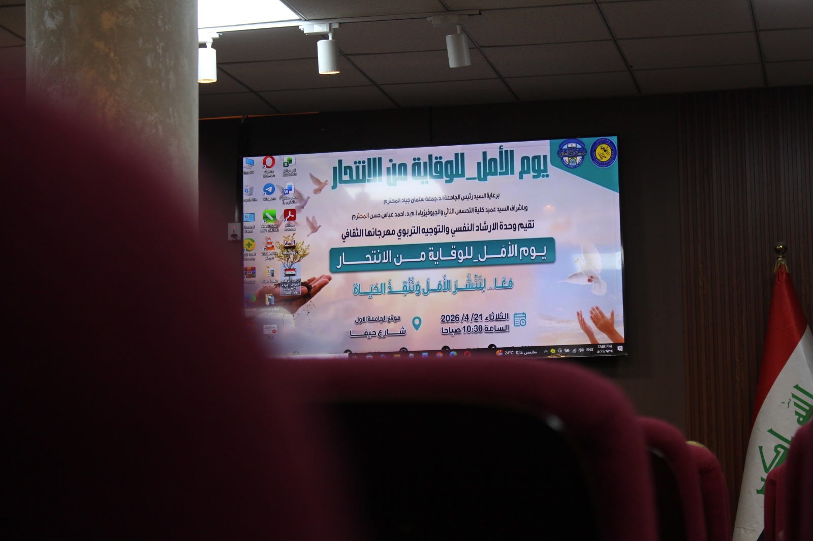 برعاية السيد رئيس جامعة الكرخ للعلوم الأستاذ الدكتور جمعة سلمان جياد المحترم، وبإشراف ومتابعة عميد كلية التحسس النائي والجيوفيزياء الاستاذ المساعد الدكتور أحمد عباس حسن ، أقامت وحدة الإرشاد النفسي الجامعي والتوجيه التربوي في الكلية ، مهرجانها الثقافي الموسوم "يوم الأمل للوقاية من الانتحار" تحت شعار: "معاً... لننشر الأمل وننقذ الحياة"، وذلك على قاعة الشهداء في موقع حيفا، بحضور عدد من تدريسيي ومنتسبي وطلبة الجامعة.