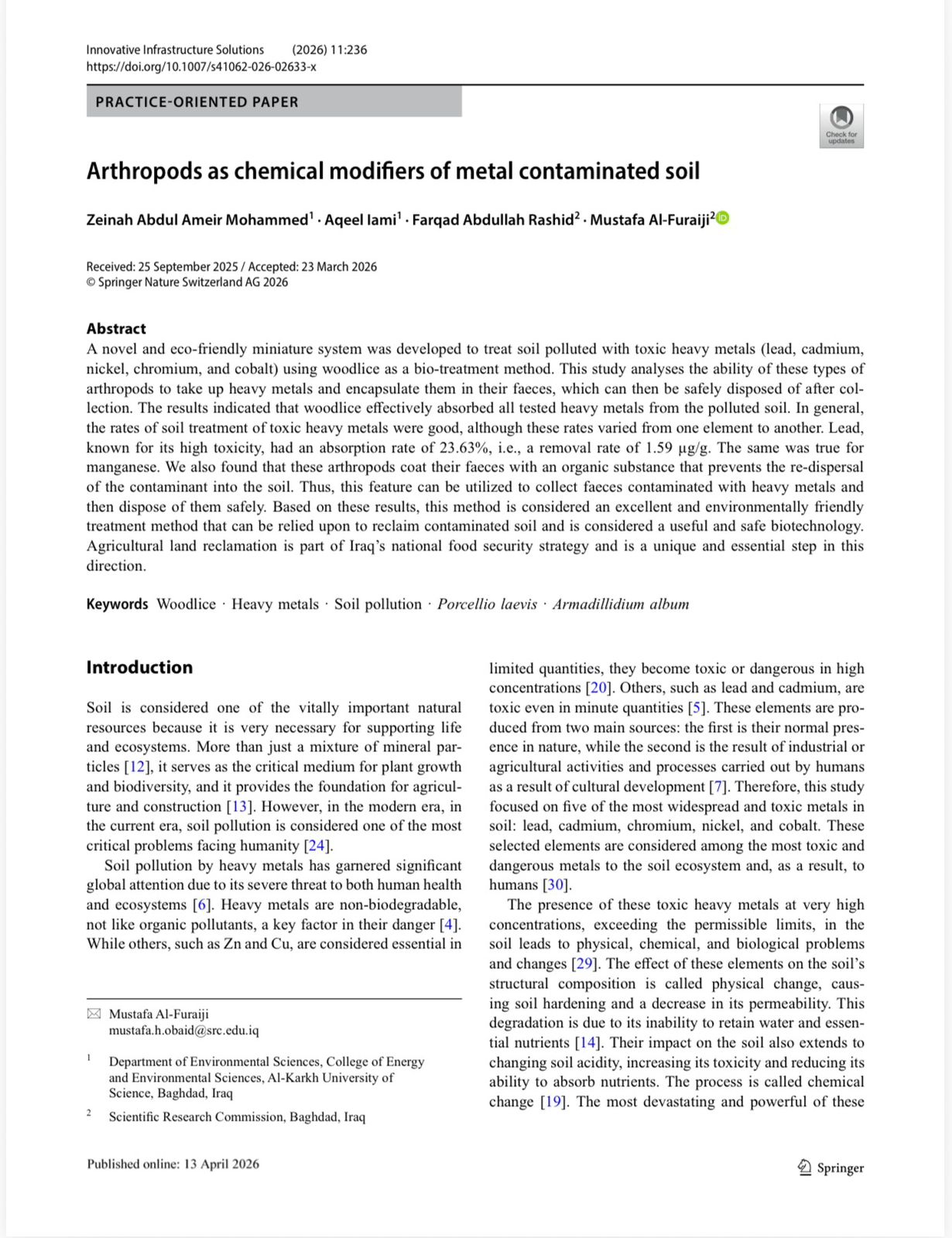 وذلك في مجلة Innovative Infrastructure Solutions لعام 2026، والمصنفة ضمن المستوعبات العالمية الرصينة، حيث حمل البحث الرقم (11:236) ويمكن الاطلاع عليه عبر الرابط: