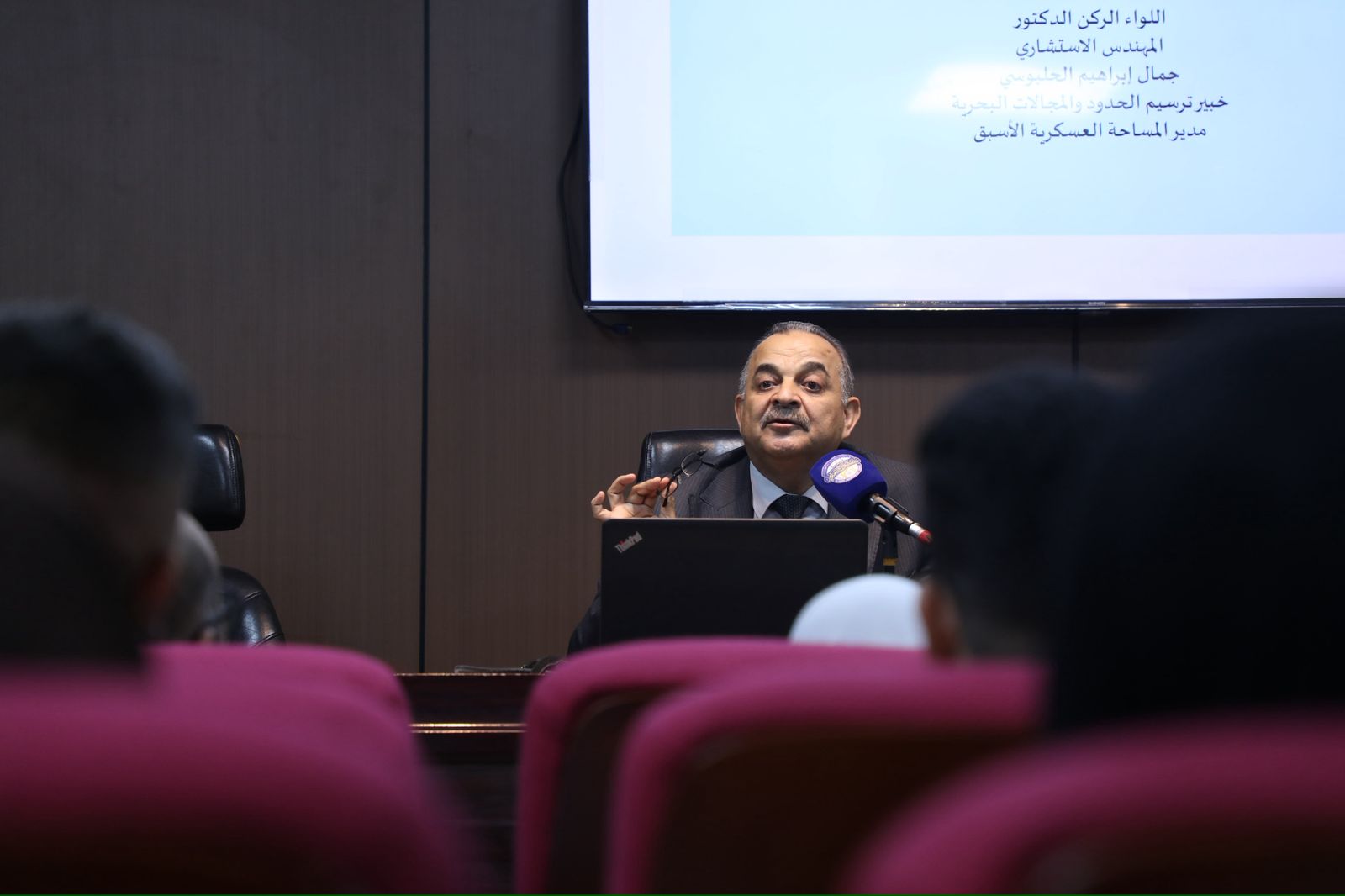 قدّم محاضرة الورشة اللواء الركن الدكتور جمال إبراهيم الحلبوسي، المتخصص في مجال ترسيم الحدود والمجالات البحرية، حيث تناول بشكلٍ مفصل الأسس القانونية التي تحكم ترسيم المجالات البحرية، مستندًا إلى القوانين والاتفاقيات الدولية ذات الصلة، إضافة إلى شرح الأبعاد الجيوسياسية والاقتصادية لهذا الملف.