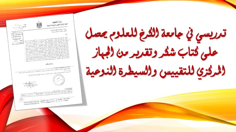 حصل الدكتور (سعد حسين خضير) التدريسي في كلية العلوم بجامعة الكرخ للعلوم على كتاب شكر وتقدير من الجهاز المركزي للتقييس والسيطرة النوعية تقديرا لجهوده المبذولة في اللجنة الفنية للحدود الميكروبية في الاغذية, متمنين له المزيد من العطاء والتوفيق والاستمرار على هذا النهج خدمة للصالح العام.
