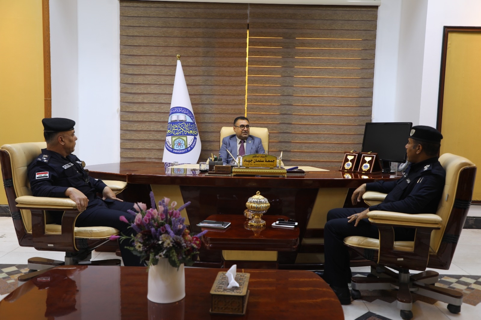 استقبل رئيس جامعة الكرخ للعلوم الأستاذ الدكتور جمعة سلمان جياد، وفداً من الشرطة المجتمعية في قاطع الصالحية برئاسة العميد محمد حكمت كامل، وذلك في مقر رئاسة الجامعة في اطار تعزيز اهداف التنمية المستدامة.