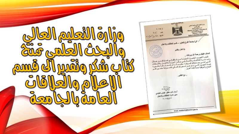 منحت دائرة الاعلام والعلاقات بوزارة التعليم العالي والبحث العلمي كتاب شكر وتقدير الى قسم الاعلام والعلاقات العامة في الجامعة , تثمينا للجهود المتميزة في رفد مركز الوزارة بالاخبار والنشاطات التي تعنى بالجامعة , متمنين للجامعة وقسم الاعلام فيها النجاح والموفقية خدمة لبلدنا العزيز.