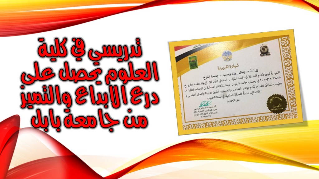 حصل رئيس قسم علوم الطاقة بكلية علوم الطاقة والبيئة في جامعة الكرخ للعلوم الدكتور جمال حميد وهيب على درع التميز والابداع اثناء مشاركته في مؤتمر جامعة بابل الدولي للابداع والمنعقد في بتاريخ 28-29/11/2018 في رحاب جامعة بابل.