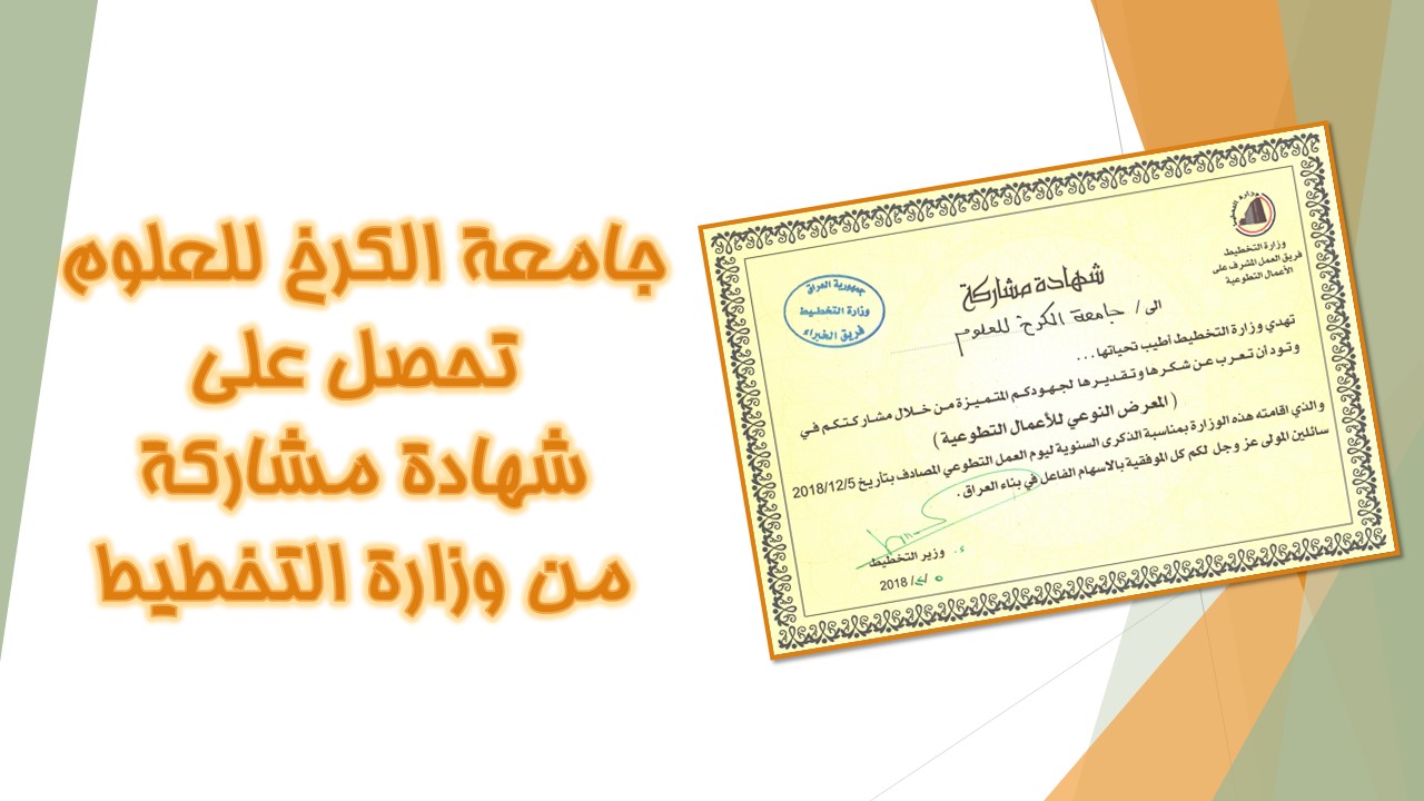 حصل قسم النشاطات الطلابية في جامعة الكرخ للعلوم على شهادة مشاركة من وزارة التخطيط لجهودهم المتميزة خلال مشاركتهم في المعرض النوعي للأعمال التطوية الذي اقامته وزارة التخطيط في الذكرى السنوية ليوم التطوع العالمي.