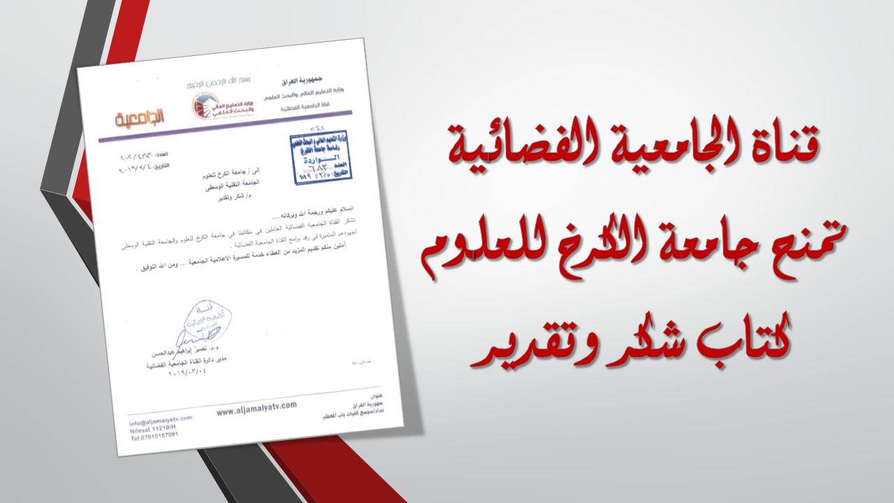 منحت قناة الجامعية الفضائية جامعة الكرخ للعلوم كتاب شكر وتقدير للجهود المبذولة والمتميزة في رفد برامج قناة الجامعية الفضائية , متمنين للجامعة وكادرها الاعلامي المزيد من العطاء خدمة للمسيرة الاعلامية الجامعية .