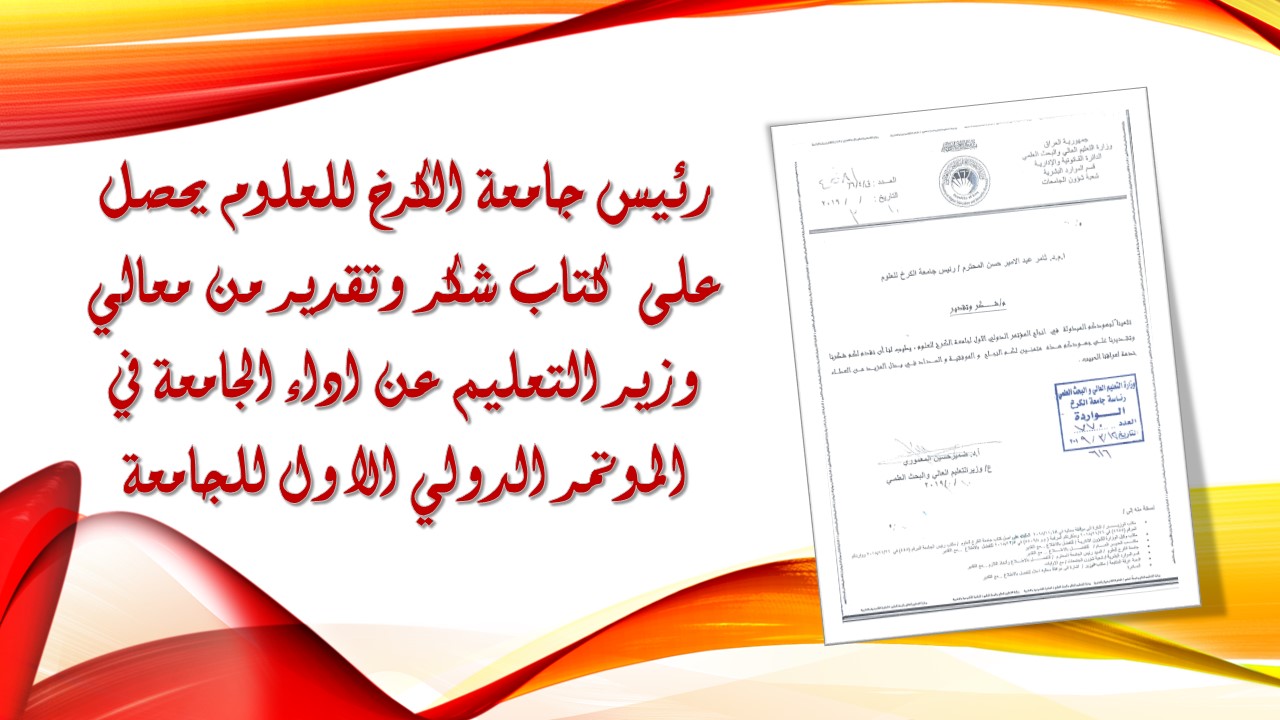 حصيلة جامعة الكرخ من كتب الشكر والتقدير من معالي الوزير عن اداء الجامعة في الموتمر الدولي الاول للاسهامات الحديثة للتحسس النائي والجيوفيزياء في الاستكشافات النفطية