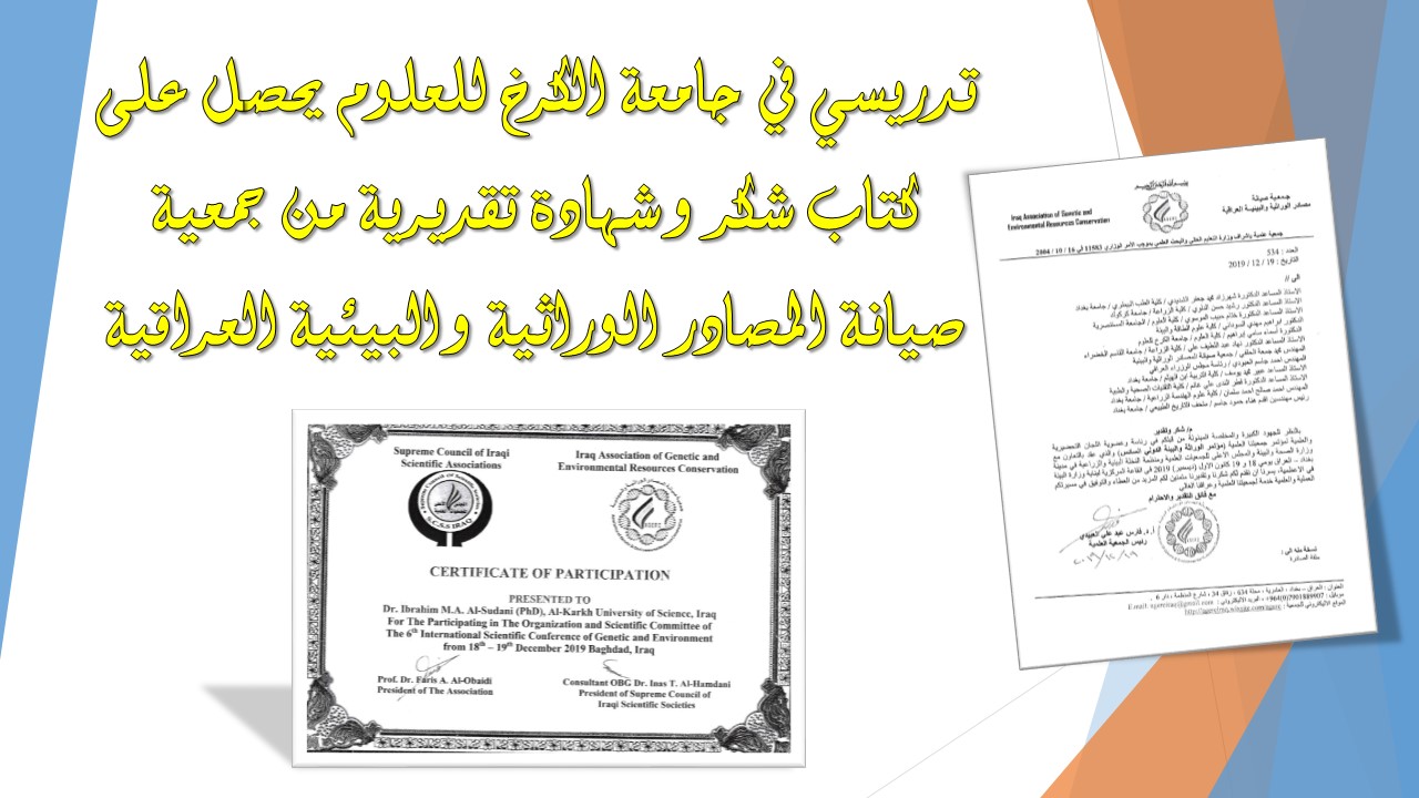 حصل الدكتور (ابراهيم مهدي عبد) التدريسي في كلية علوم الطاقة والبيئة بجامعة الكرخ للعلوم على كتاب شكر وشهادة تقديرية من جمعية صيانة المصادر الوراثية والبيئية العراقية تقديرا لجهوده المبذولة في عضوية اللجان التحضيرية لمؤتمر الوراثة والبيئة الدولي السادس والذي عقد بالتعاون مع وزارة الصحة والبيئة والمجلس الاعلى للجمعيات العلمية ومنظمة نخلة البيئية والزراعية , متمنين له المزيد من العطاء والتوفيق في المسيرة العلمية والعملية خدمة للعراق الغالي.
