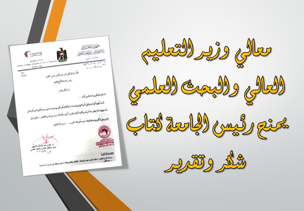 منح معالي وزير التعليم العالي والبحث العلمي الدكتور قصي السهيل المحترم كتاب شكر وتقدير الى السيد رئيس الجامعة الدكتور ثامر عبد الامير حسن المحترم تثمينا للجهود المذولة في تأدية المهام والواجبات الموكله اليه بكل مهنية.