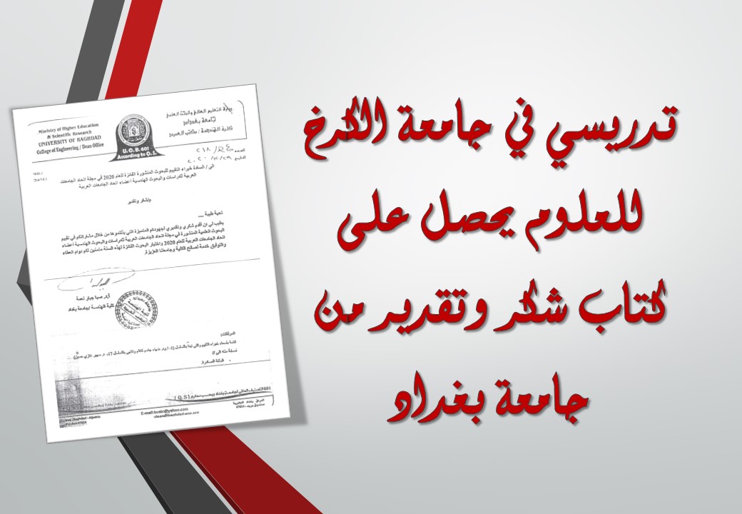 حصل التدريسي في كلية التحسس النائي والجيوفيزياء بجامعة الكرخ للعلوم (م.د علي عبد الوهاب محمد) على كتاب شكر وتقدير من كلية الهندسة بجامعة بغداد.